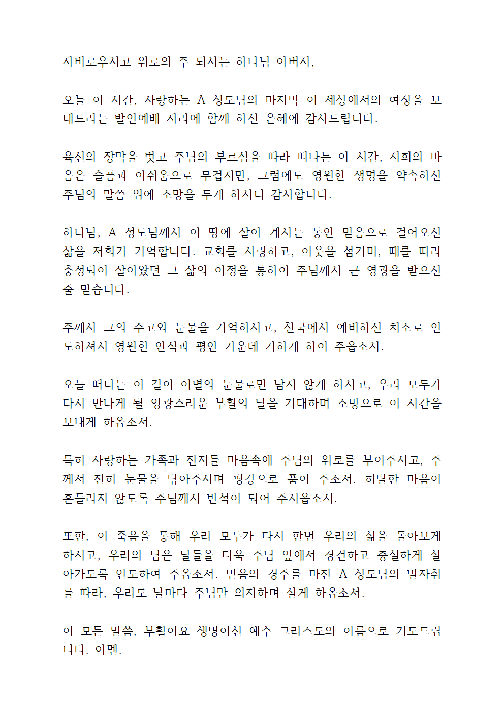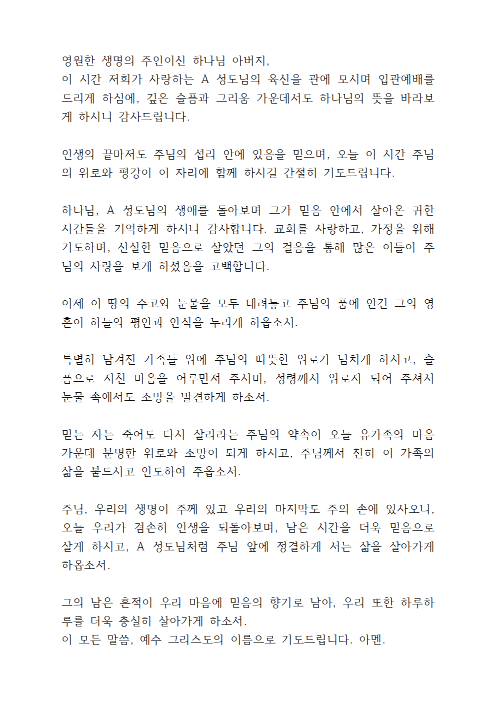 또한, 이 죽음을 통해 우리 모두가 다시 한번 우리의 삶을 돌아보게 하시고, 우리의 남은 날들을 더욱 주님 앞에서 경건하고 충실하게 살아가도록 인도하여 주옵소서. 믿음의 경주를 마친 A 성도님의 발자취를 따라, 우리도 날마다 주님만 의지하며 살게 하옵소서.