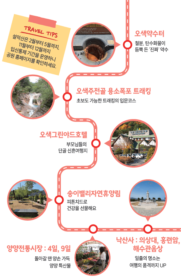 오색약수터 ↔ 오색주전골 용소폭포 ↔ 오색그린야드 호텔 ↔ 송이밸리 자연휴양림 ↔ 양양 전통시장 ↔ 낙산사