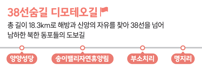 38선 숨길 디모테오길은 양양 성당에서 출발해서 명지리마을까지 18km에 이르는 코스입니다.