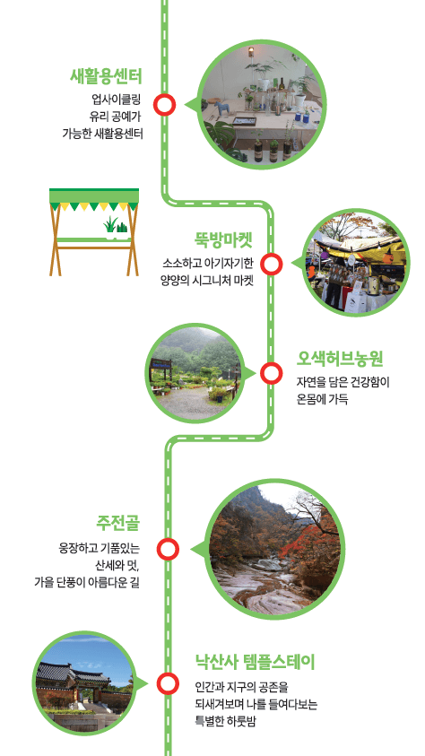 새활용센터 ↔ 뚝방마켓 ↔ 오색허브농원 ↔ 주전골 ↔ 낙산사 템플스테이