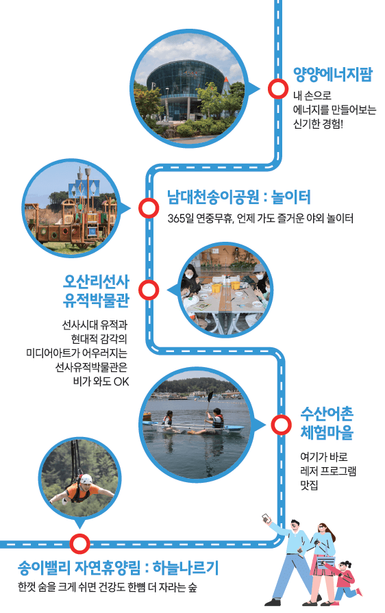 양양에너지팜 ↔ 남대천송이공원 ↔ 오산리선사유적박물관 ↔ 수산어촌체험마을 ↔ 송이밸리 자연휴양림