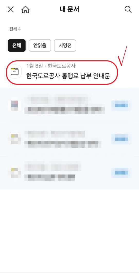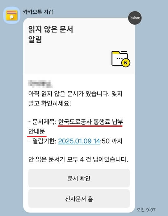 "한국도로공사 통행료 납부 안내문"을 확인합니다.