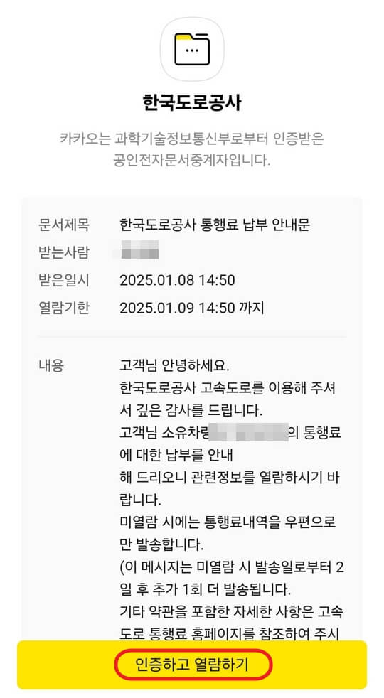 "한국도로공사"에서 온 안내문을 열람하기 위해 "인증 절차"를 진행합니다.
