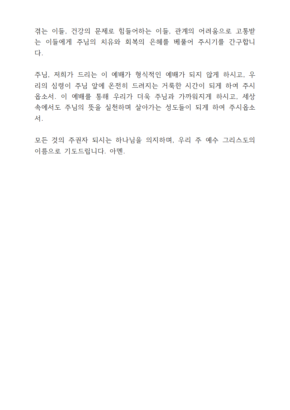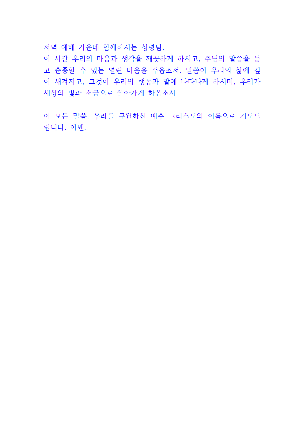 이 모든 말씀, 우리의 생명의 주인이시며 구원자 되시는 예수 그리스도의 이름으로 기도드립니다. 아멘.