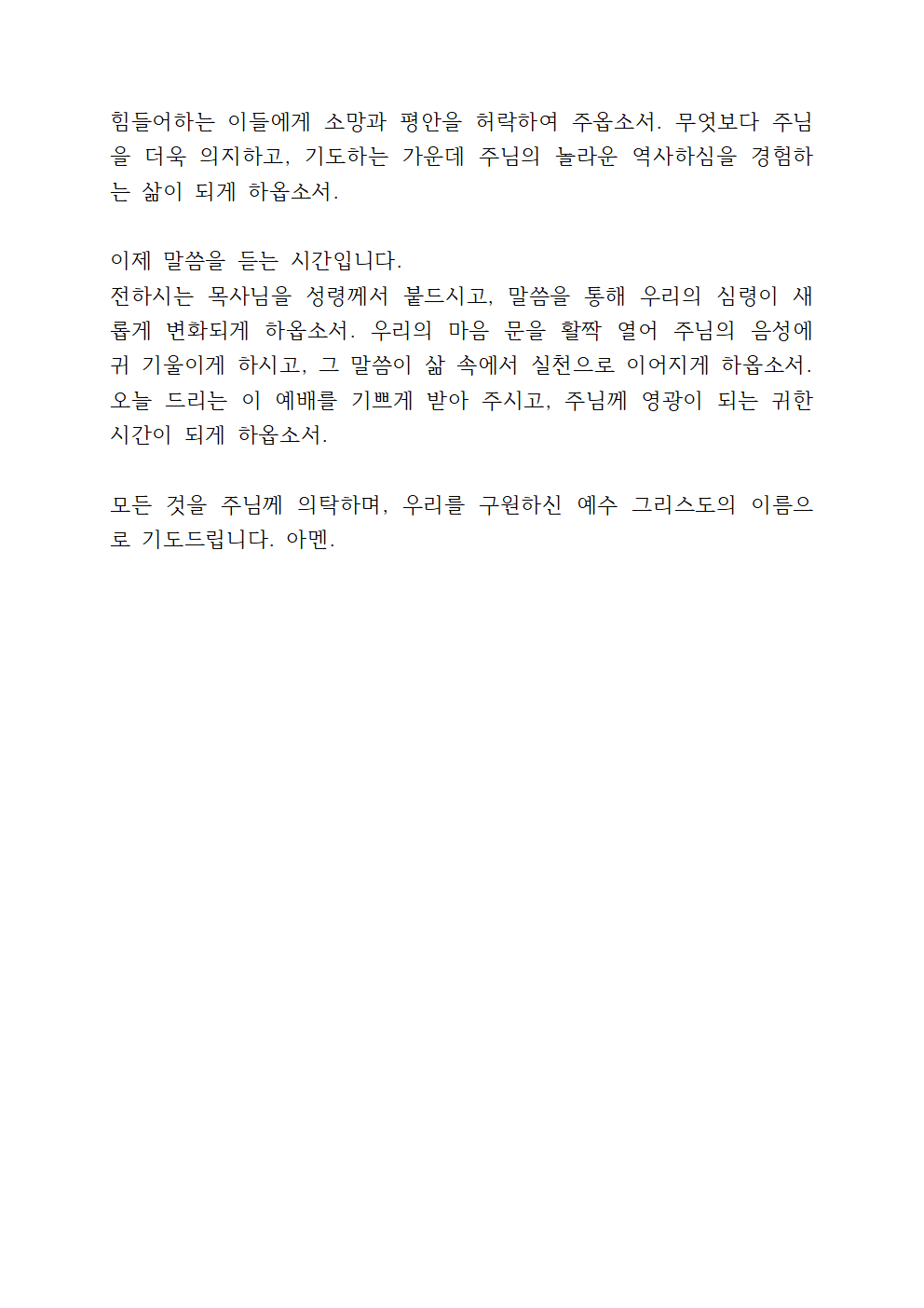 오늘 이곳에 모인 성도들이 말씀을 통해 주님의 뜻을 발견하고, 삶 속에서 온전히 실천할 수 있도록 인도하여 주옵소서. 말씀을 전하시는 목사님께 성령의 능력을 덧입혀 주시고, 선포되는 말씀이 우리의 심령을 변화시키는 능력이 되게 하옵소서. 우리의 예배가 형식적인 자리가 아닌, 살아 계신 하나님을 경험하는 시간이 되도록 인도하여 주시기를 간절히 원합니다. 주님, 한 주간의 삶도 주님께 맡깁니다.