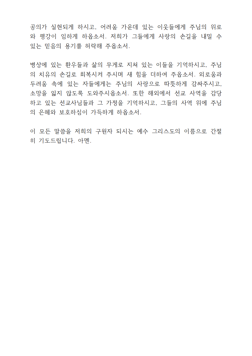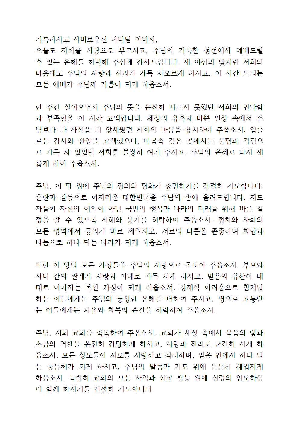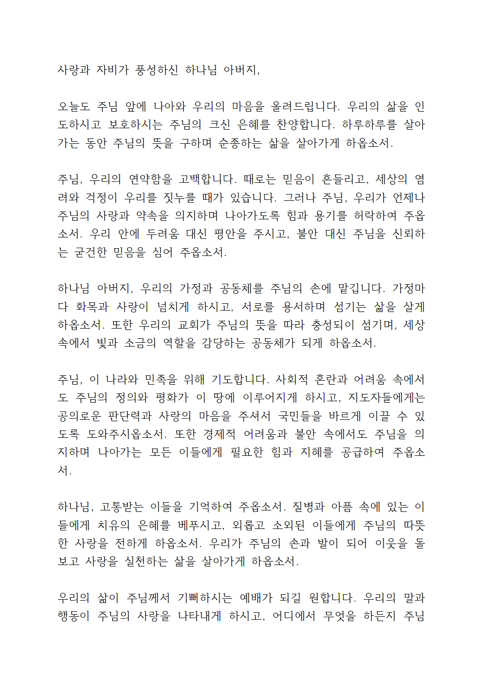 자비로우신 주님, 이 나라와 민족을 위해 기도합니다. 정의와 평화가 강물처럼 흐르는 나라가 되게 하시고, 지도자들에게 지혜와 정직함을 허락하여 주옵소서. 특별히 어려움과 고통 속에 있는 이들에게 위로와 소망을 주시고, 경제적 어려움과 질병으로 인해 힘들어하는 이들에게 주님의 치유와 회복이 임하게 하여 주옵소서.