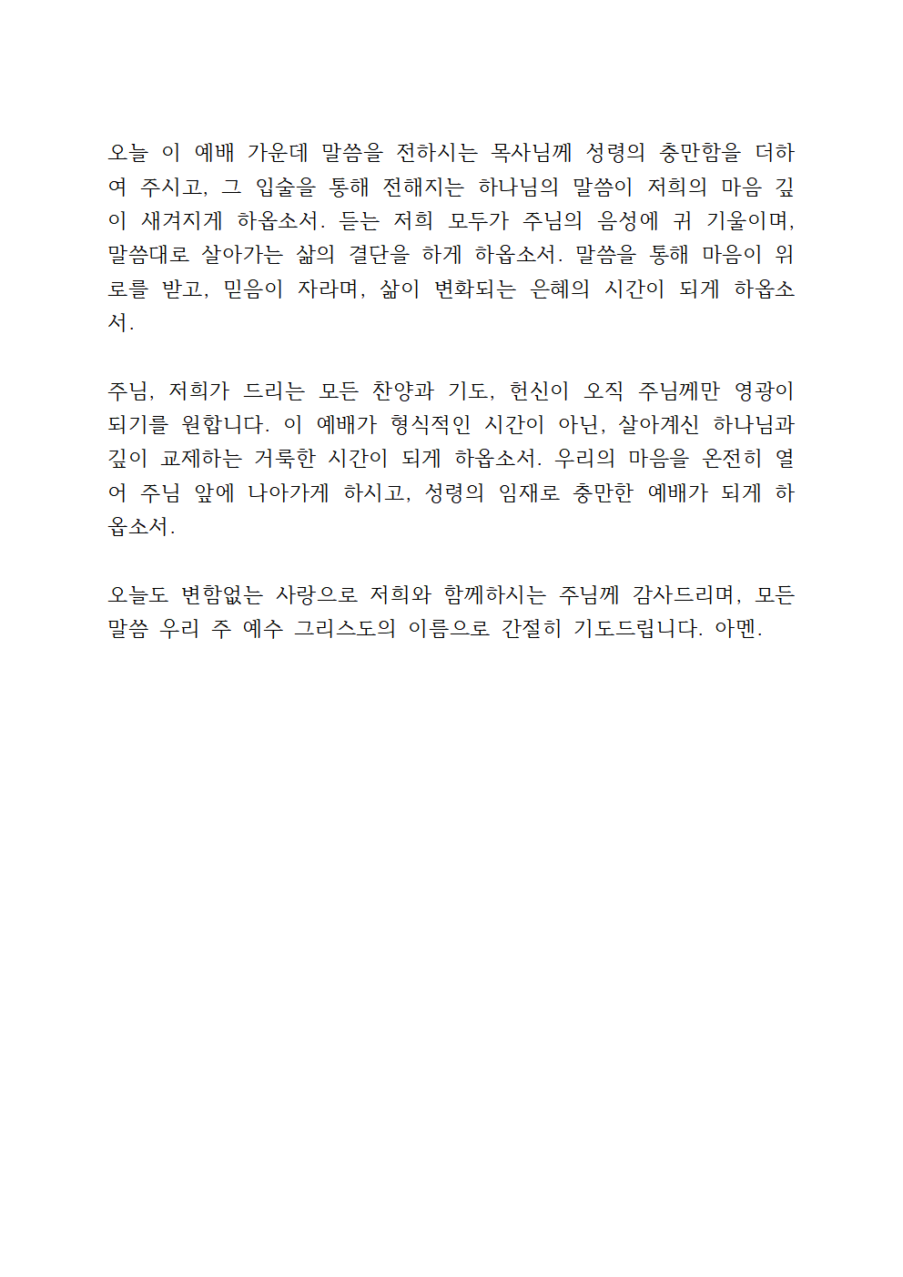 오늘 예배를 통해 주님께 영광 돌리게 하시고, 말씀을 전하시는 목사님에게 성령의 능력을 덧입혀 주시옵소서. 듣는 모든 성도들이 말씀을 통해 은혜를 경험하고, 삶 속에서 주님의 뜻을 실천하는 결단을 하게 하여 주옵소서. 예배 가운데 우리의 찬양과 기도가 온전히 주님께 올려지게 하시고, 주님의 임재를 경험하는 귀한 시간이 되게 하여 주옵소서.