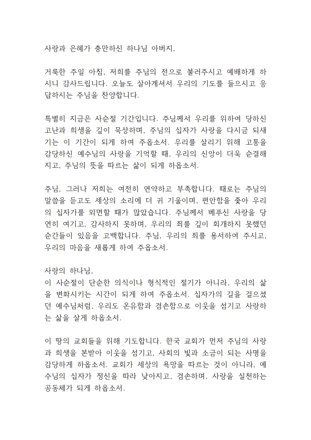 이 사순절이 단순한 의식이나 형식적인 절기가 아니라, 우리의 삶을 변화시키는 시간이 되게 하여 주옵소서. 십자가의 길을 걸으셨던 예수님처럼, 우리도 온유함과 겸손함으로 이웃을 섬기고 사랑하는 삶을 살게 하옵소서.