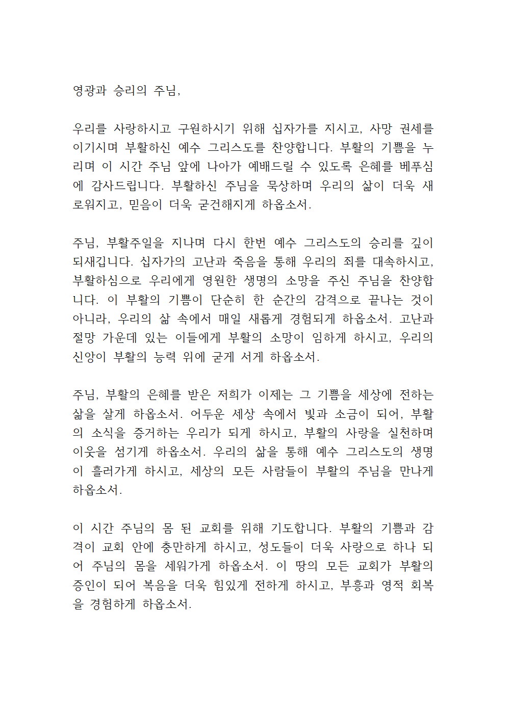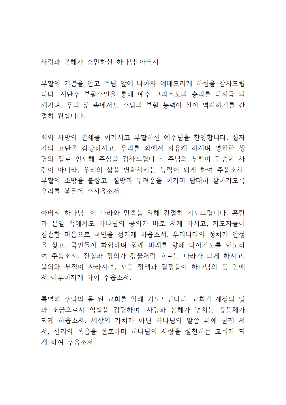 우리 각 성도들의 삶을 위해서도 기도합니다. 부활의 능력을 힘입어 날마다 새롭게 변화되며, 믿음으로 승리하는 삶을 살게 하옵소서. 우리의 가정과 직장, 학교와 사회에서 주님의 사랑과 평안을 전하는 자들이 되게 하시고, 모든 어려움 속에서도 주님을 의지하며 끝까지 신앙을 지키게 하옵소서.