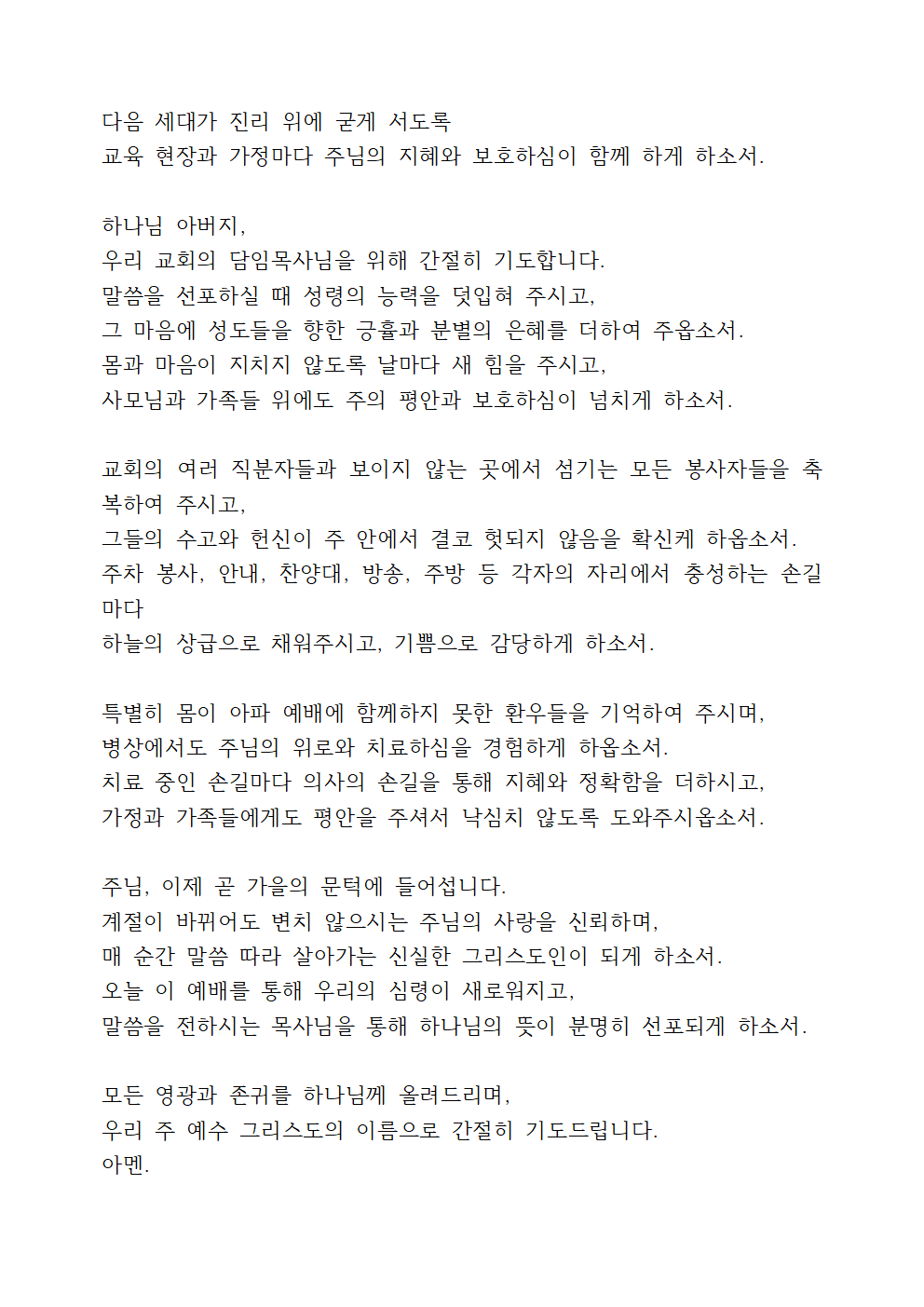 주님, 우리 교회를 축복하여 주옵소서. 여름 사역을 통해 흘리신 눈물과 헌신이 헛되지 않게 하시고, 이제 시작되는 가을 사역 위에도 성령의 열매가 맺히게 하옵소서. 교회가 지역 사회 안에서 희망의 불빛이 되고, 성도 간의 사랑이 따뜻하게 흘러넘치며, 예배가 기쁨과 능력으로 가득 차게 하옵소서. 목회자와 리더들에게는 겸손과 지혜를 더하시어 주님의 뜻을 따라 교회를 잘 이끌게 하옵소서.