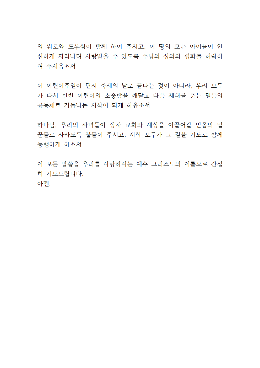 예배를 위해 수고하는 모든 손길과, 이 시간 함께 예배드리는 모든 성도들에게 하늘의 평강과 은혜가 충만하게 임하기를 간절히 소망하오며, 우리 주 예수 그리스도의 이름으로 기도드립니다.