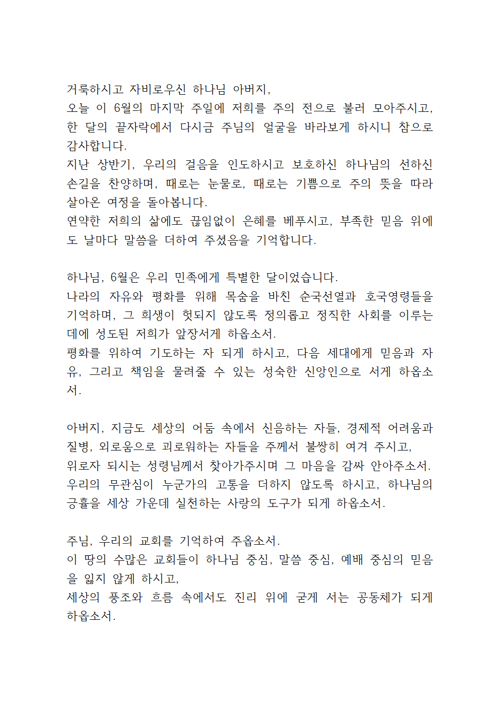 오늘 이 6월의 마지막 주일에 저희를 주의 전으로 불러 모아 주시고, 한 달의 끝자락에서 다시금 주님의 얼굴을 바라보게 하시니 참으로 감사합니다. 지난 상반기, 우리의 걸음을 인도하시고 보호하신 하나님의 선하신 손길을 찬양하며, 때로는 눈물로, 때로는 기쁨으로 주의 뜻을 따라 살아온 여정을 돌아봅니다. 연약한 저희의 삶에도 끊임없이 은혜를 베푸시고, 부족한 믿음 위에도 날마다 말씀을 더하여 주셨음을 기억합니다.