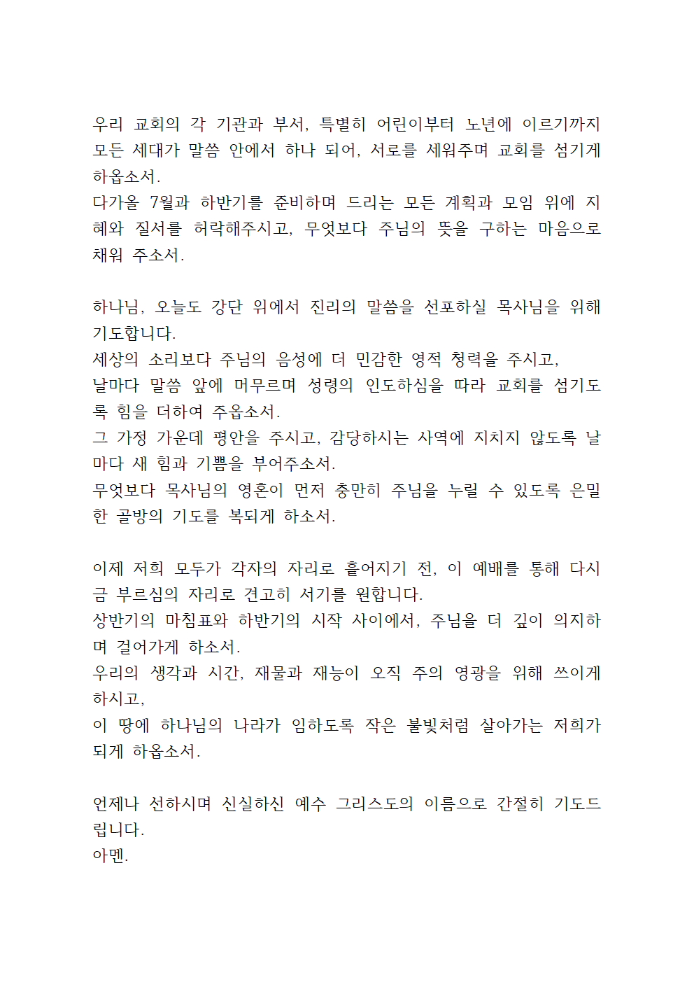 우리 교회의 각 기관과 부서, 특별히 어린이부터 노년에 이르기까지 모든 세대가 말씀 안에서 하나 되어, 서로를 세워주며 교회를 섬기게 하옵소서. 다가올 7월과 하반기를 준비하며 드리는 모든 계획과 모임 위에 지혜와 질서를 허락해 주시고, 무엇보다 주님의 뜻을 구하는 마음으로 채워 주소서.
