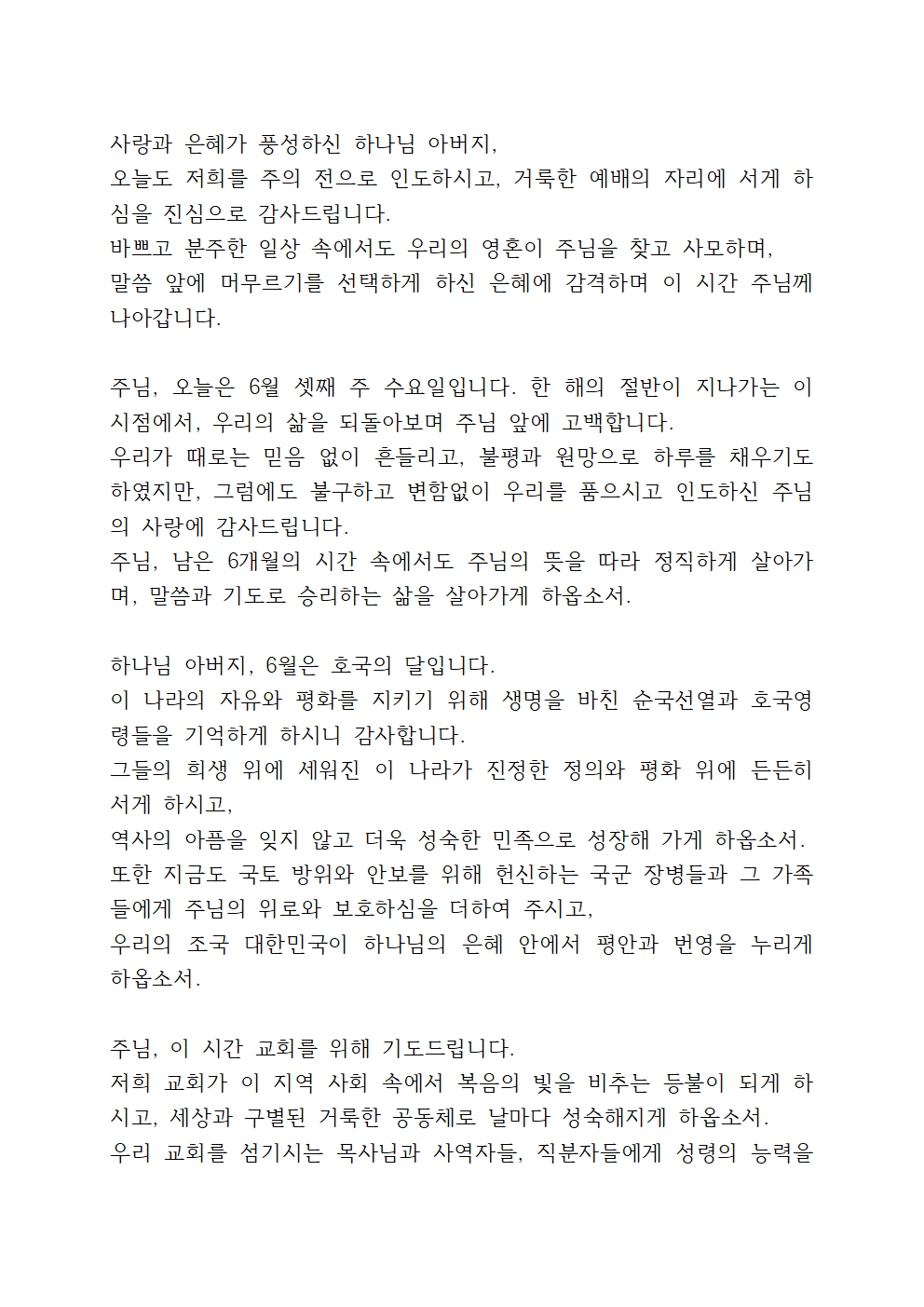 이번 글에서는 6월 셋째 주 수요예배 대표기도문을 안내해 드릴게요.