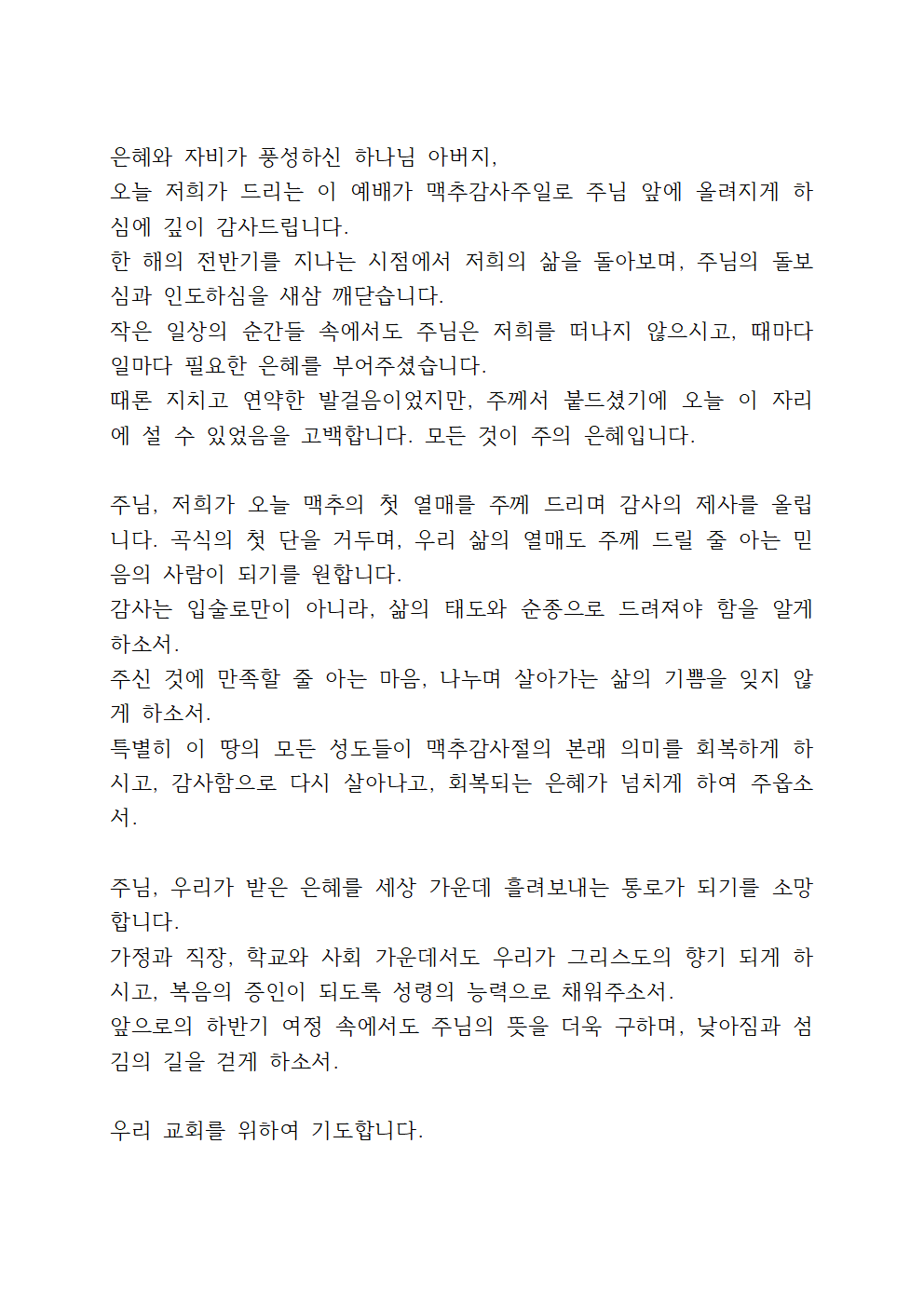 그런 의미에서, 이번 기도는 감사의 기도를 중심으로, 남은 반년도 주님의 인도하심을 간구하며 드리면 좋을 듯합니다.