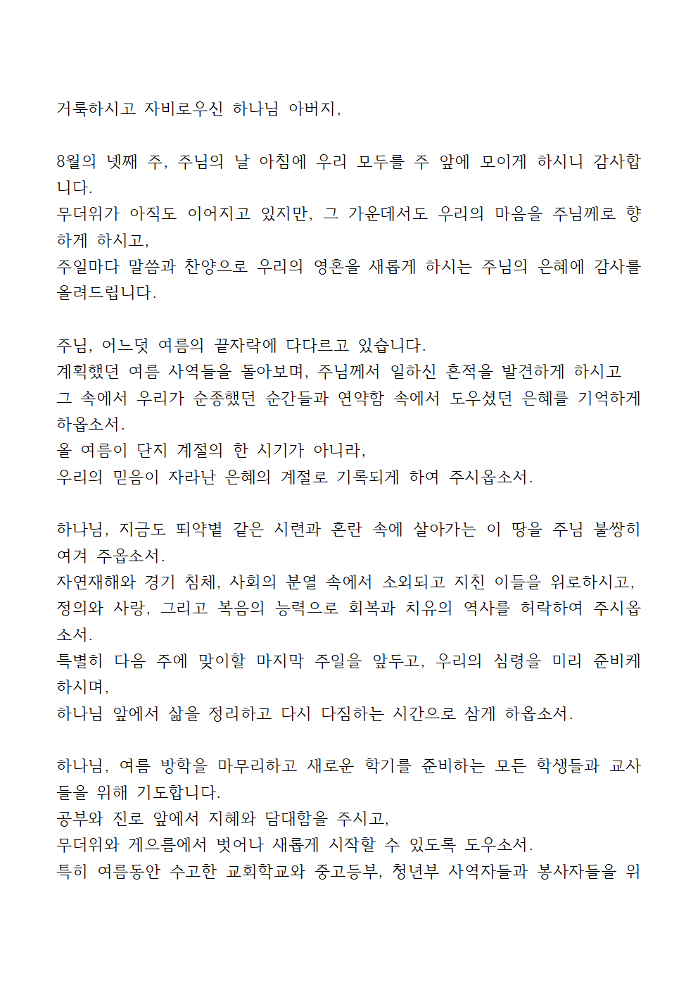 이번 글에서는 8월 넷째주일 낮 예배 대표기도문을 안내해 드리겠습니다.