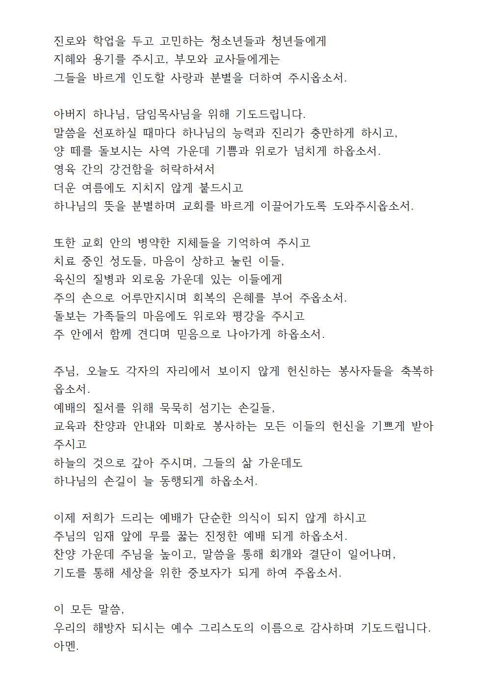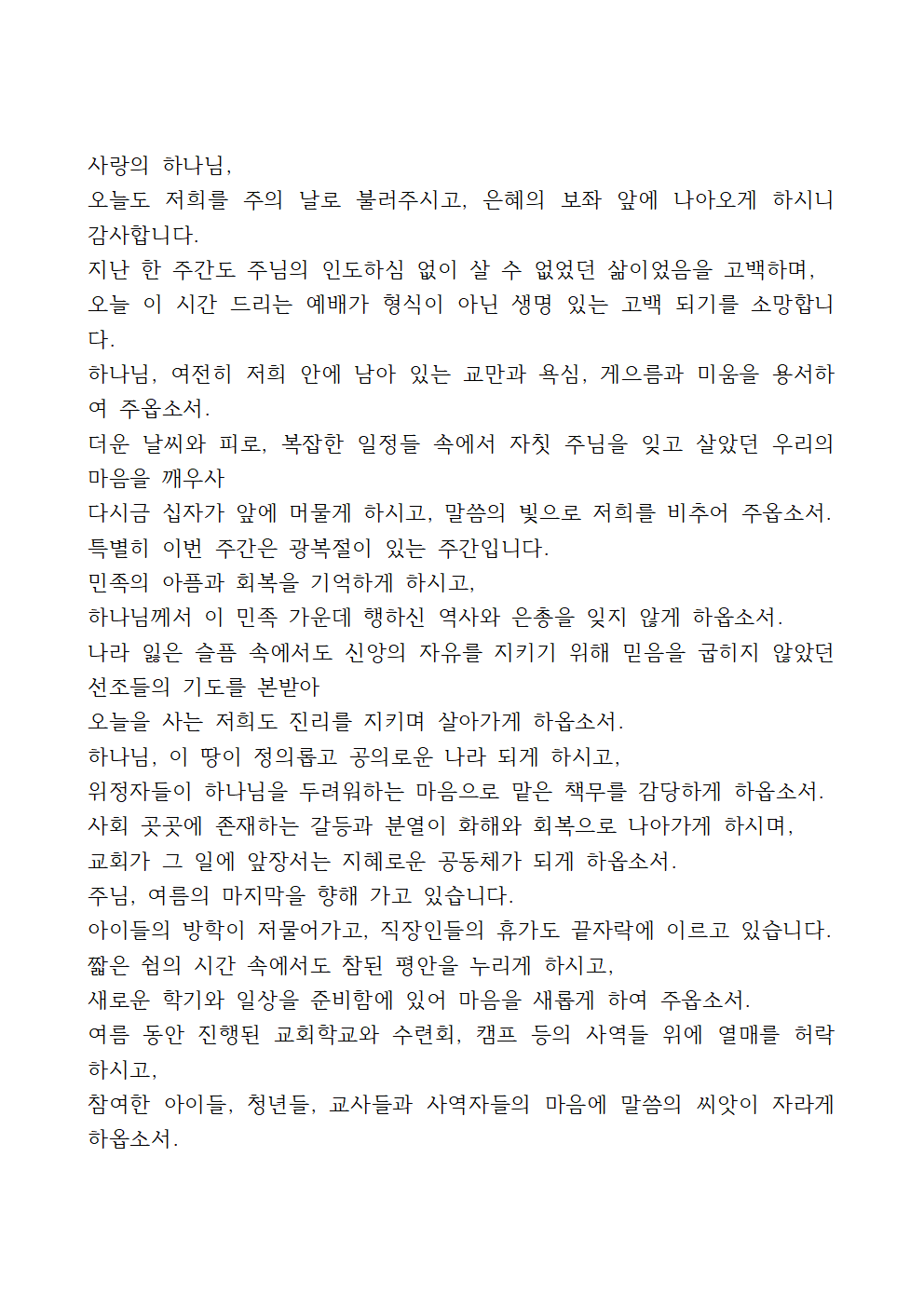 '8월 둘째주일 낮예배 대표기도문 모음 (hwp 파일)'