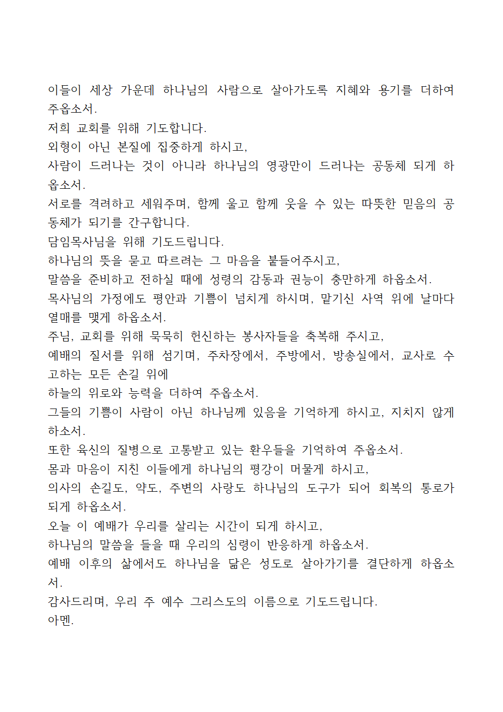 또한 병상에 있는 환우들과 삶의 무게에 눌린 성도들, 외롭고 지친 이들에게 주의 따뜻한 손길을 허락해 주셔서 다시 일어설 힘과 위로를 얻게 하옵소서.