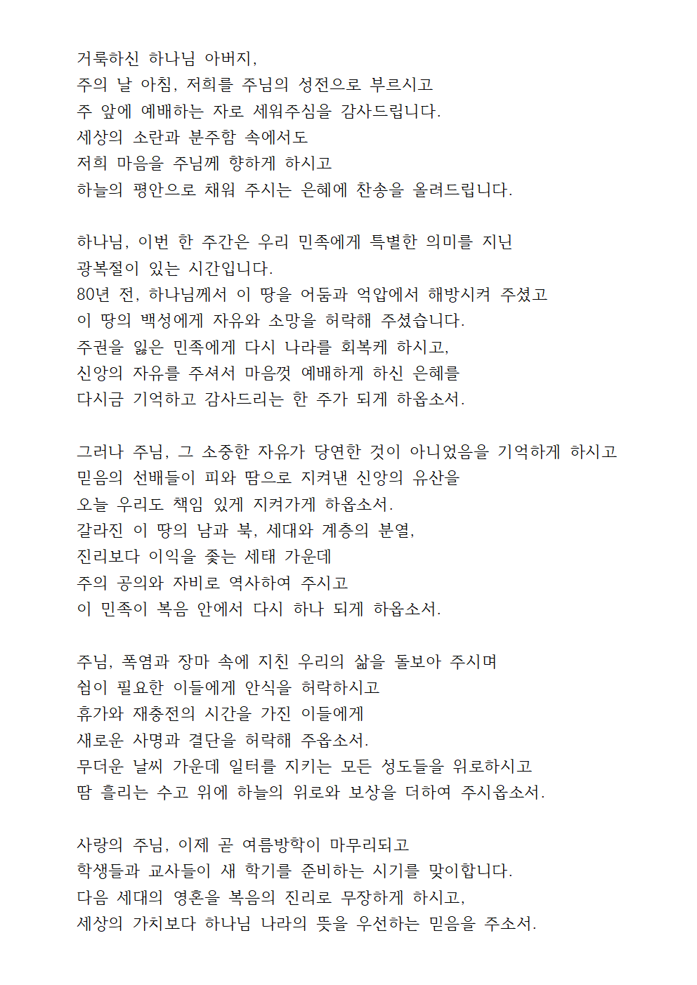 일제의 압제에서 해방되어 자유를 누릴 수 있도록 이 땅을 구원하신 하나님의 섭리를 기억하게 하시고, 수많은 이들의 눈물과 희생 위에 세워진 이 나라가 하나님의 공의와 진리 위에 굳건히 서게 하옵소서.