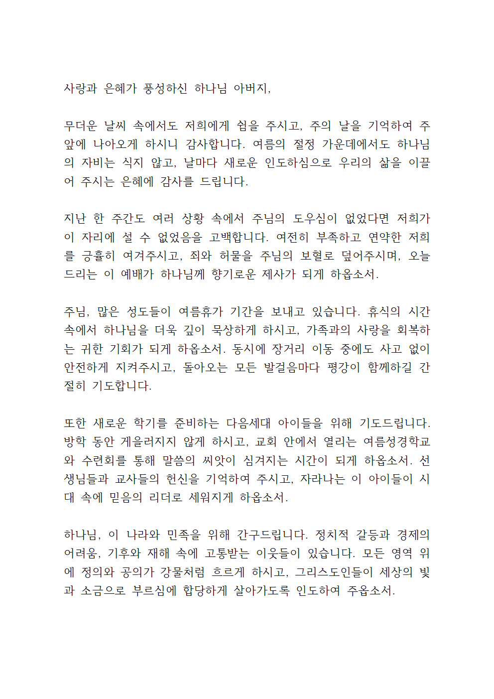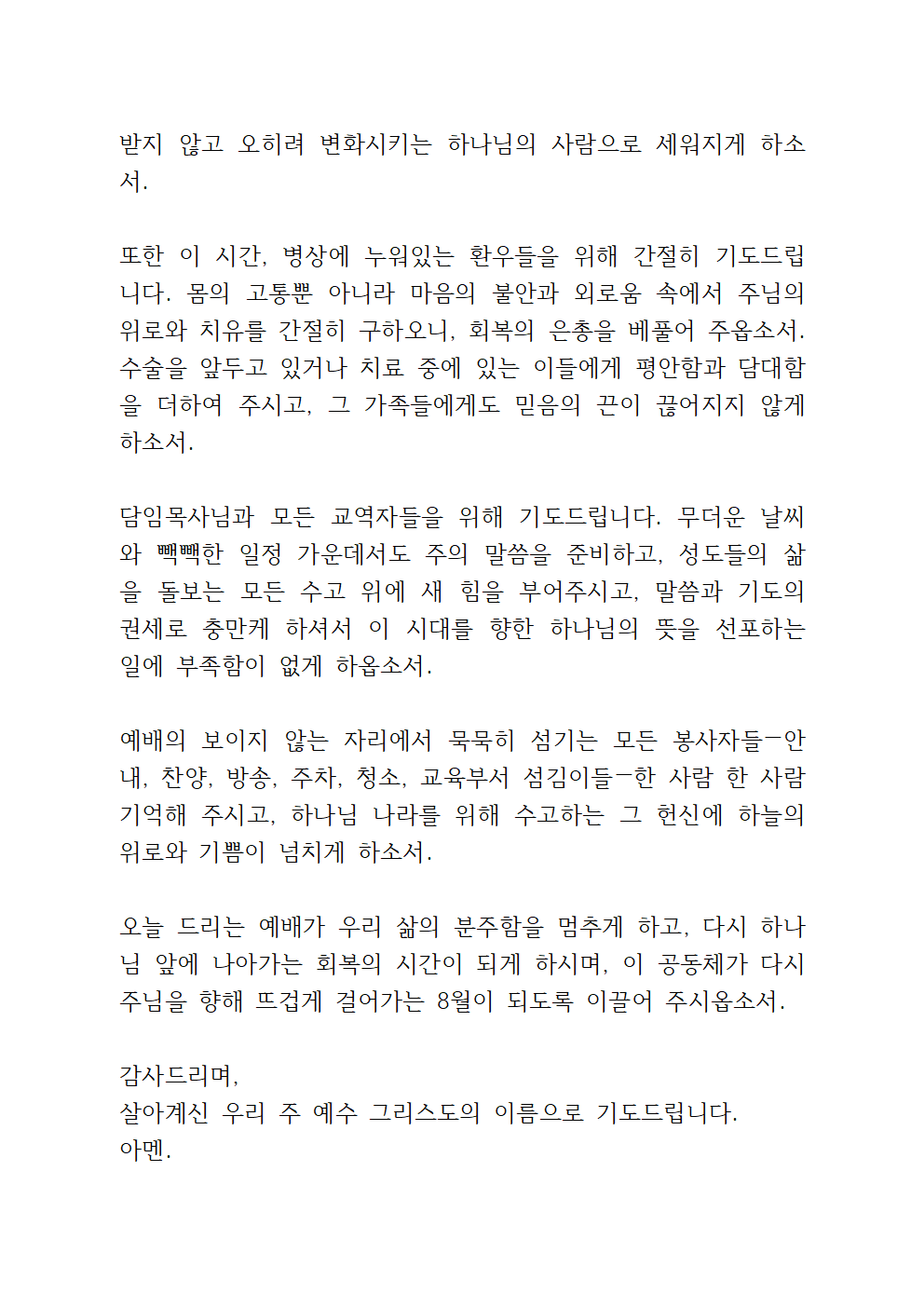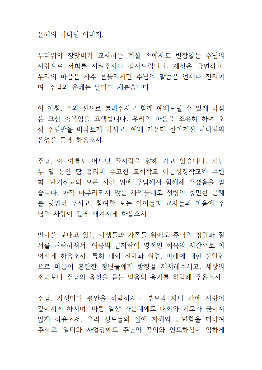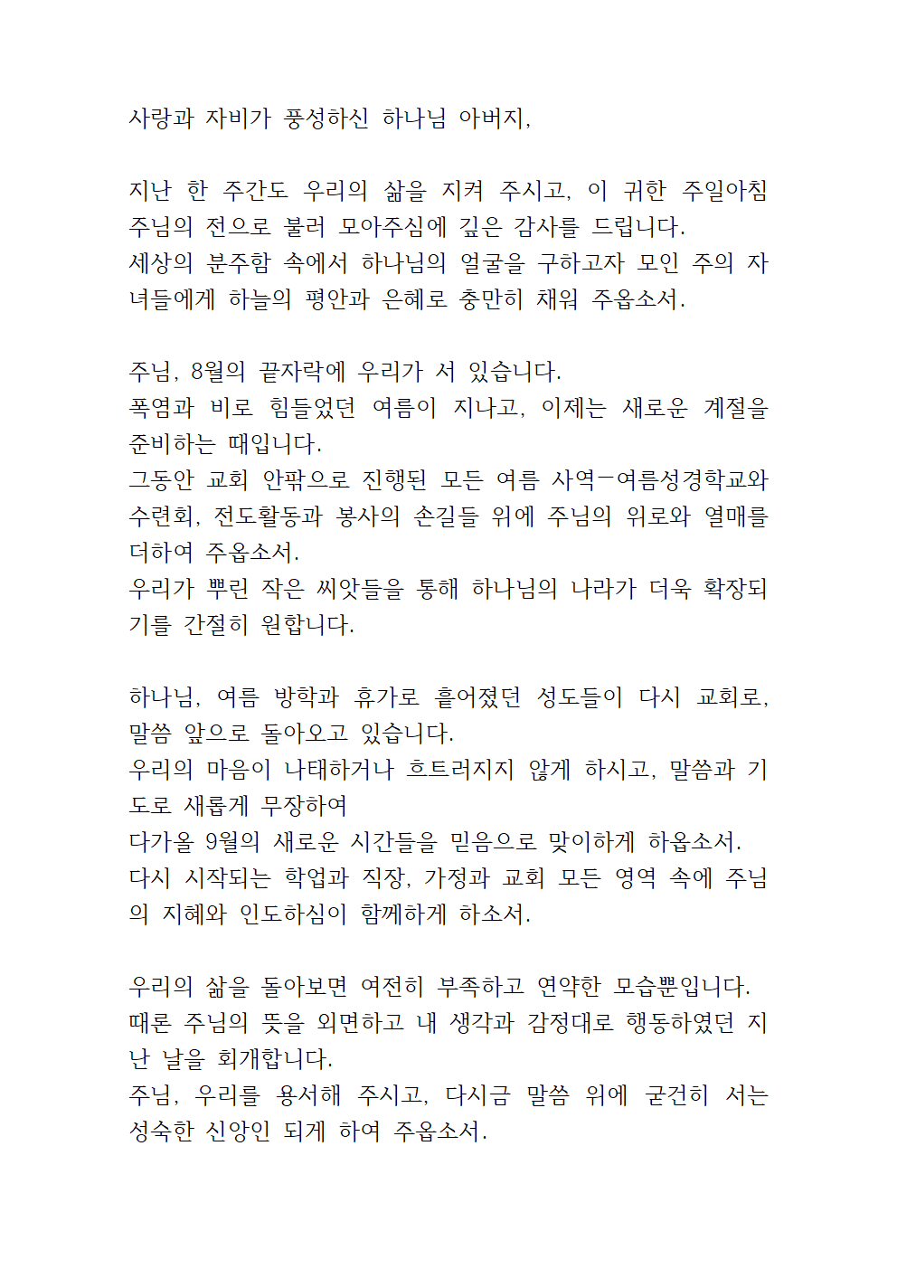 8월 수요예배 대표기도문
