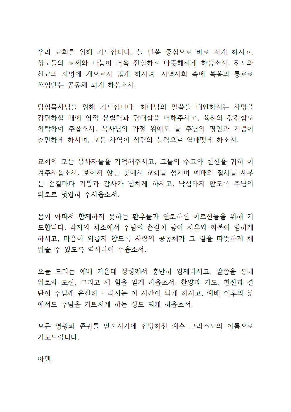 8월 주일예배 대표 기도 시 아래의 기도문(hwp 파일 첨부)을 참고해서 기도해 보세요.