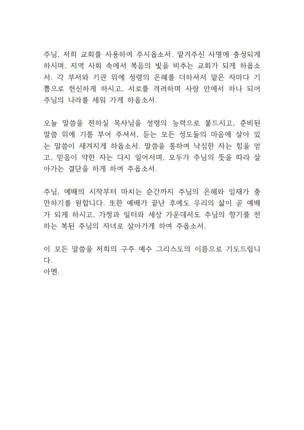 주님, 오늘 드려지는 이 예배를 기쁘게 받아 주옵소서. 우리의 찬양과 기도가 형식으로 흐르지 않게 하시고, 말씀을 통해 우리의 심령이 변화되며, 결단과 순종으로 응답하게 하옵소서. 세상의 소망이 아닌 주님만을 의지하며, 한 주간을 믿음으로 살아가는 성도 되게 하옵소서.